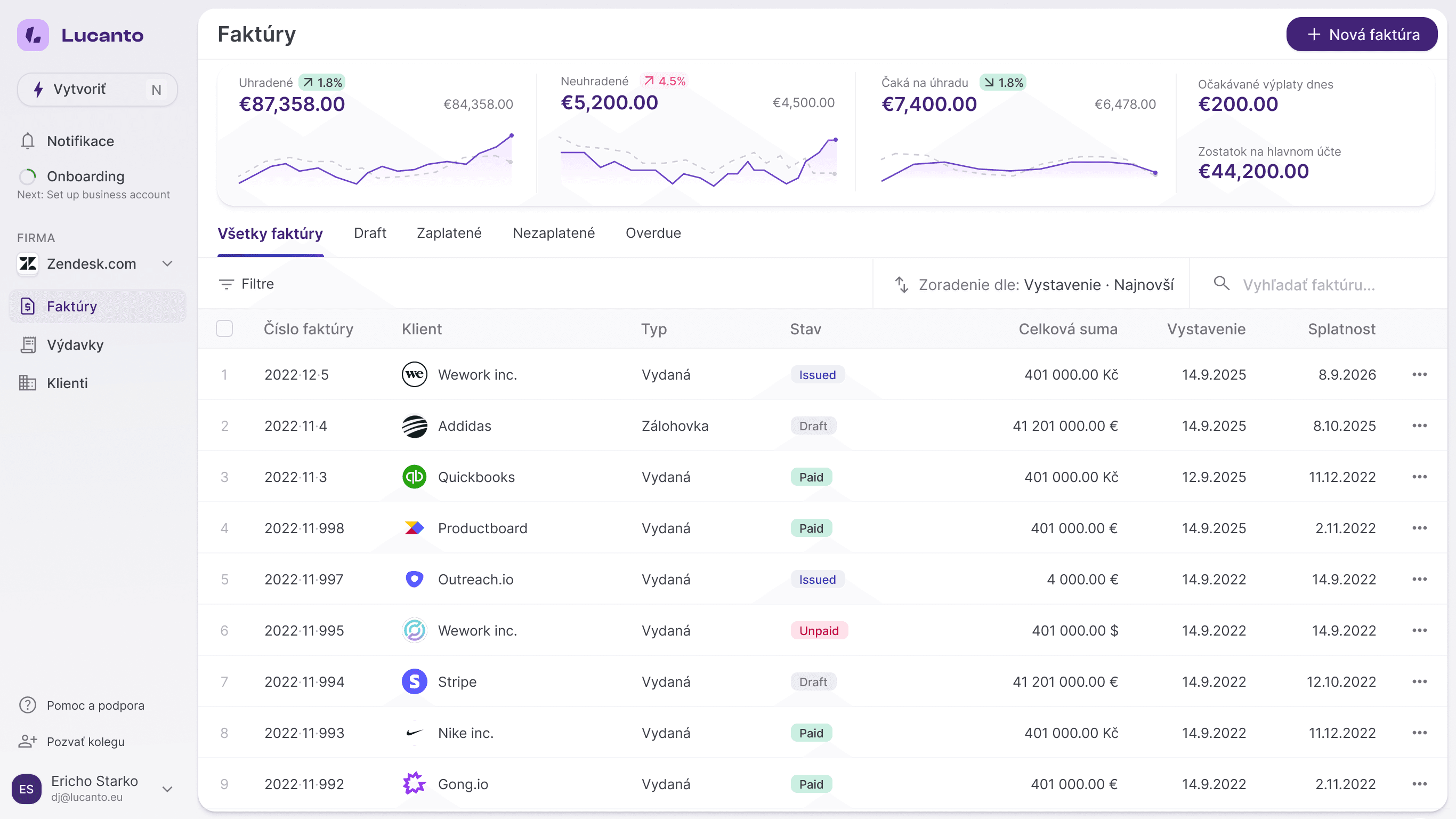 Fakturuj vo viacerých jazykoch a menách. Bez premýšľania, bez limitov. V Lucante zatiaľ vystavíš faktúru v akejkoľvek mene a v štyroch jazykoch (EN, SK, CZ, RO). Ďalšie pribudnú čoskoro.